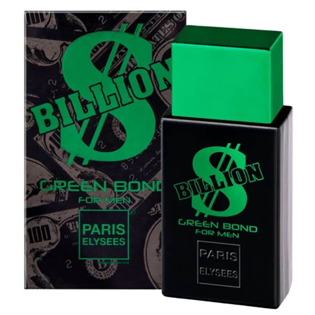 Billion Green Bond Eau de Toilette da marca Paris Elysees tem inspiração na cor verde das notas de dólares, moeda americana.